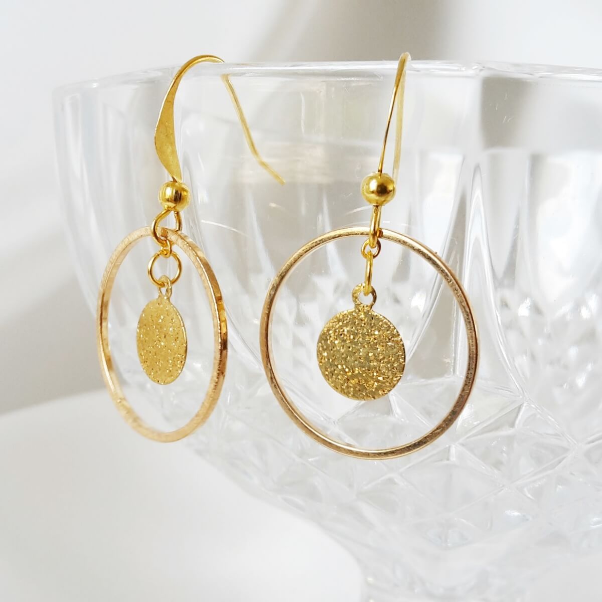 Ces boucles d’oreilles sont composées chacune d’un cercle doré arborant en leur centre un sequin doré effet pailleté.