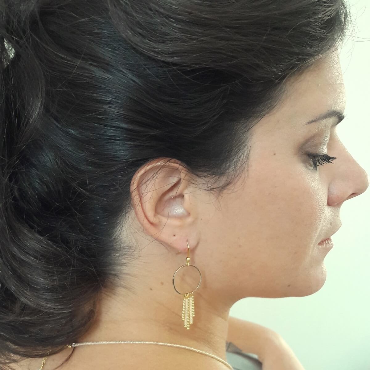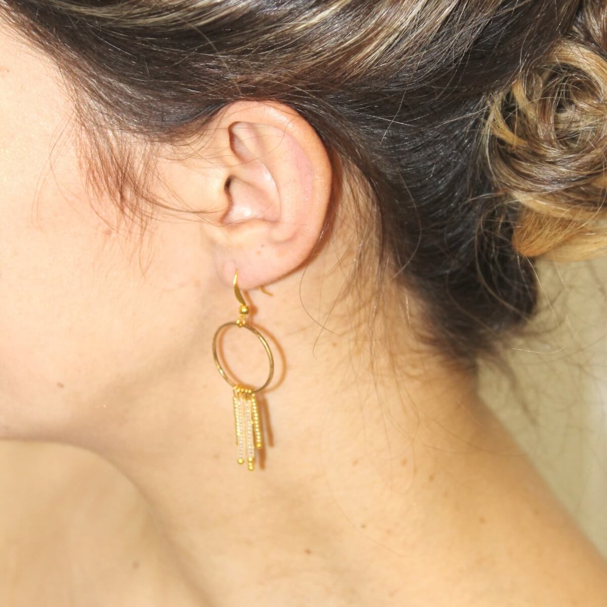 Ces boucles d’oreilles mesurent 5 cm. Les ornements sont fixés à des crochets d’oreilles dorés.