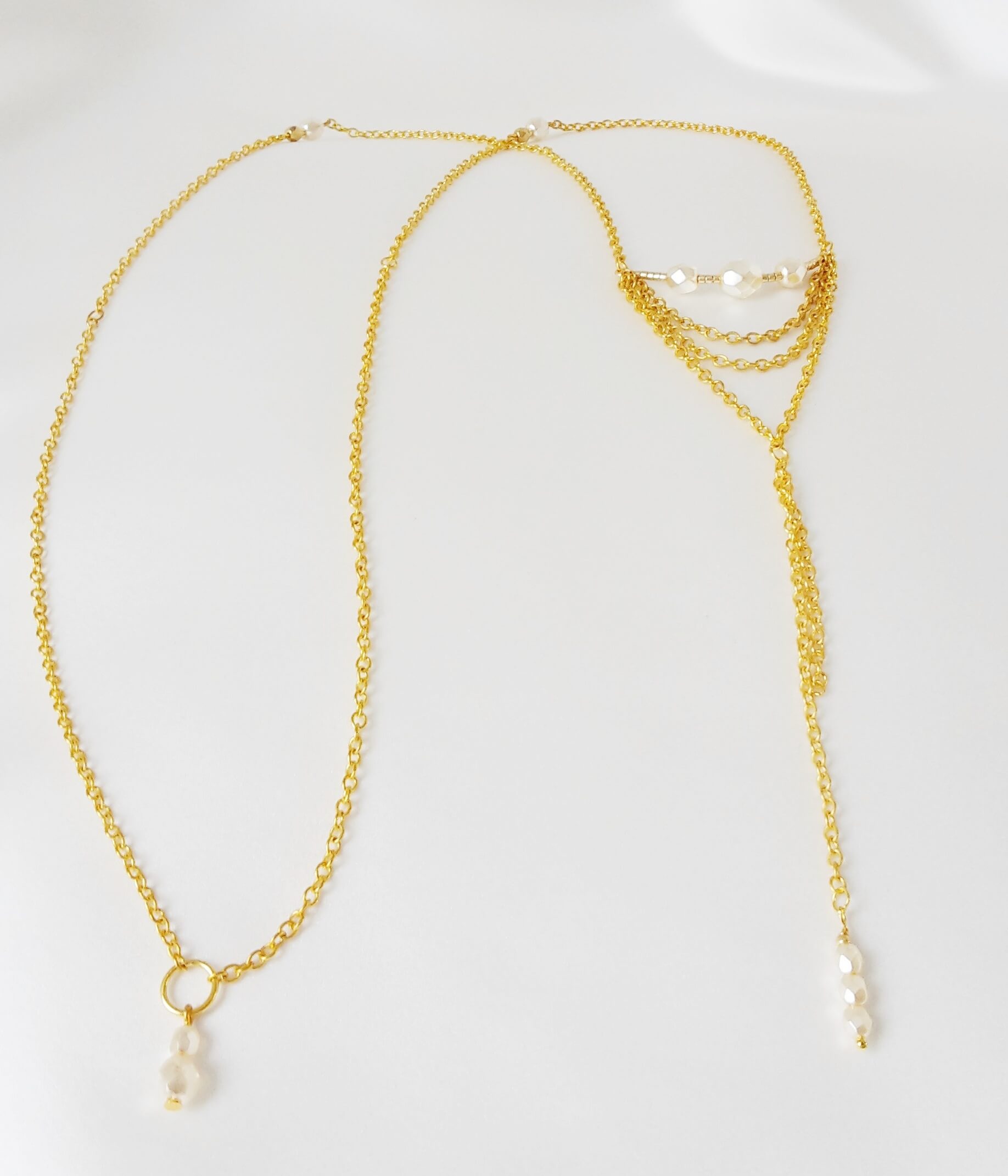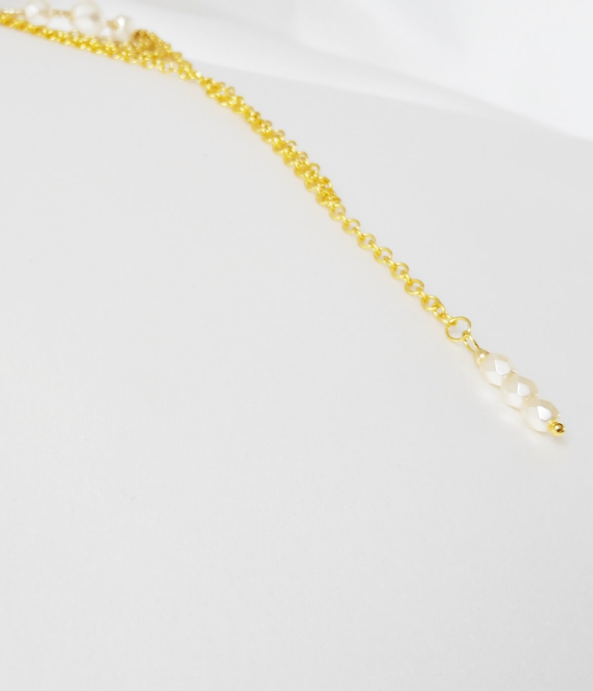 Il est composé d’une base en fine chaîne doré agrémentée de perles nacrées en verre de bohème « Preciosa Ornela », couleur crème clair, de perles à facettes en plaqué or 24K et de perles Miyuki Delicas en plaqué or 24k également.