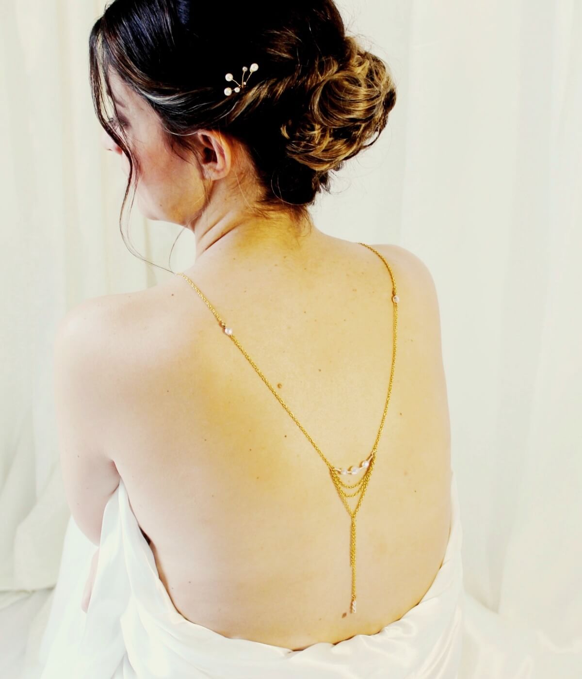 L’Ornement de Dos ADÉLAÏDE est un sautoir de dos s’enfilant par la tête. Ce collier de dos ne possède pas de fermoir.