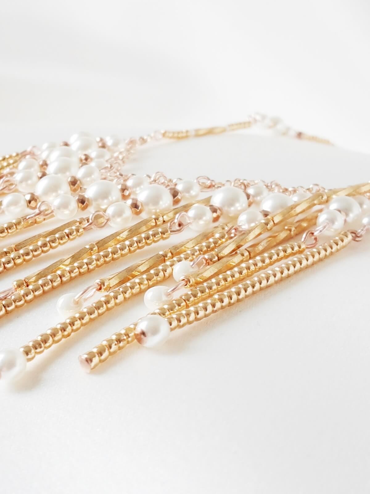 Disponible en base rocaille doré, doré rose, argenté, champagne et avec des perles blanches ou crème.