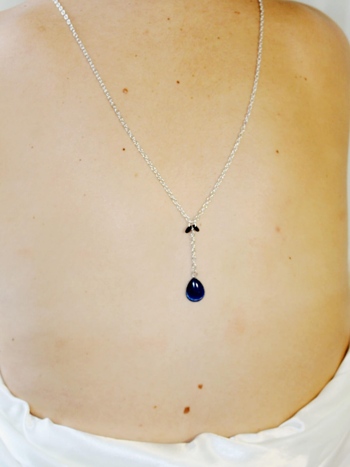 Le sautoir à une longueur dans le dos de 24 cm à partir de la base du cou.