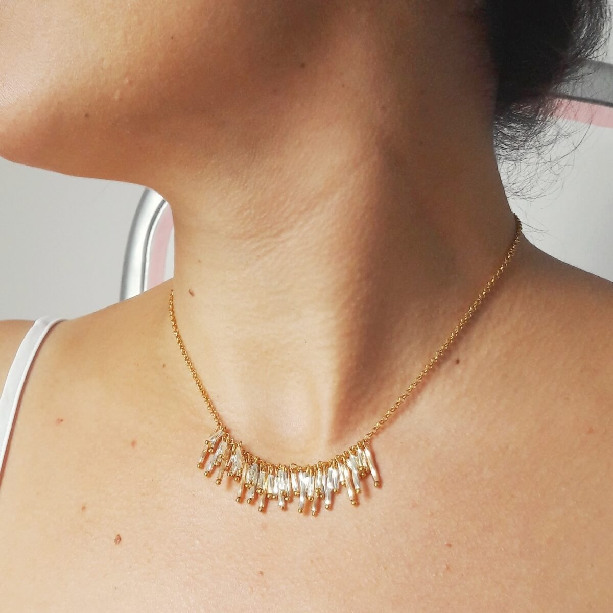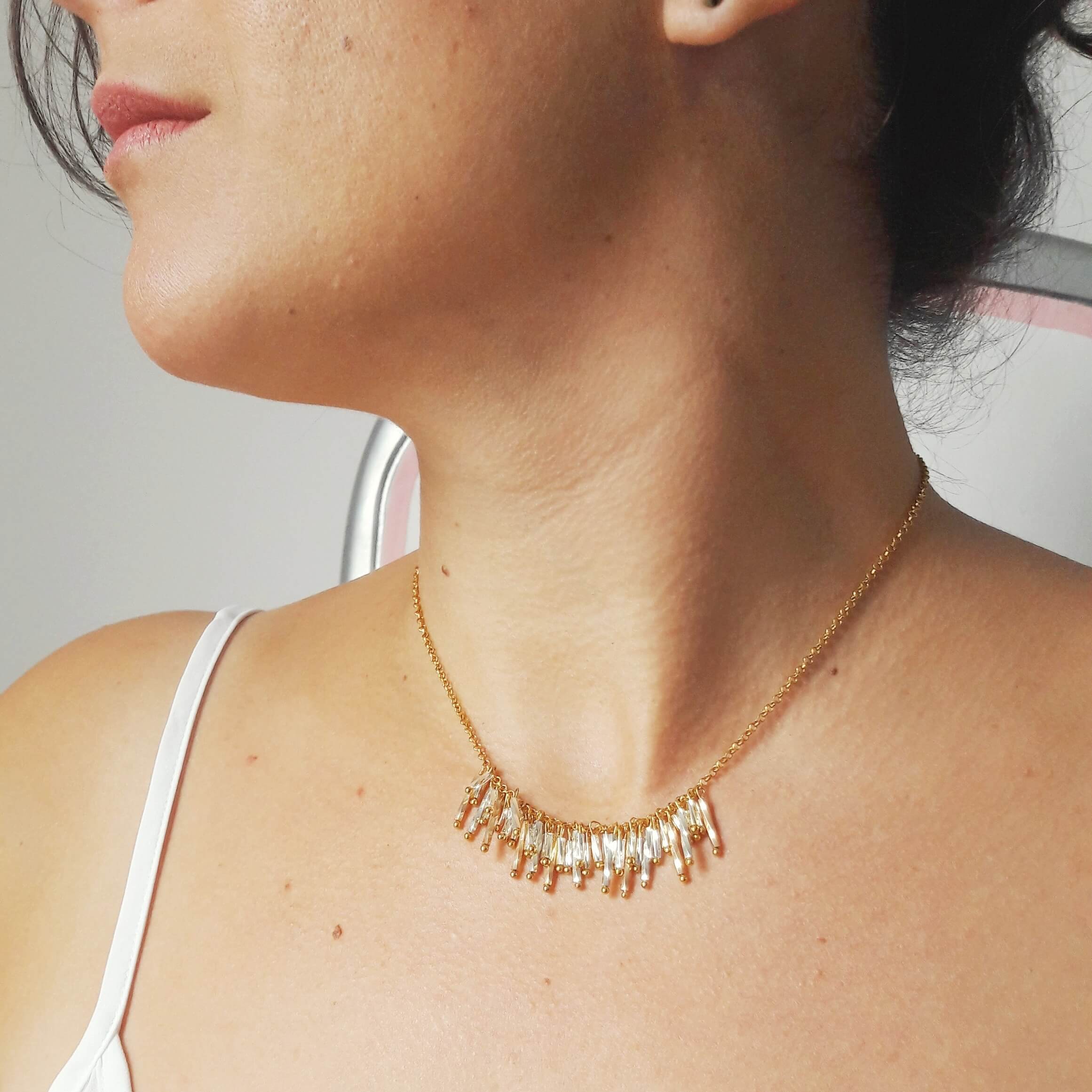 L’Ornement de Cou CLÉMENCE est un collier de mariée éclatant et original composé d’une fine chaîne dorée et au centre d’un rang formé d’une multitude de perles tubes « Miyuki » finition dorée, argentée, et doré rose.
