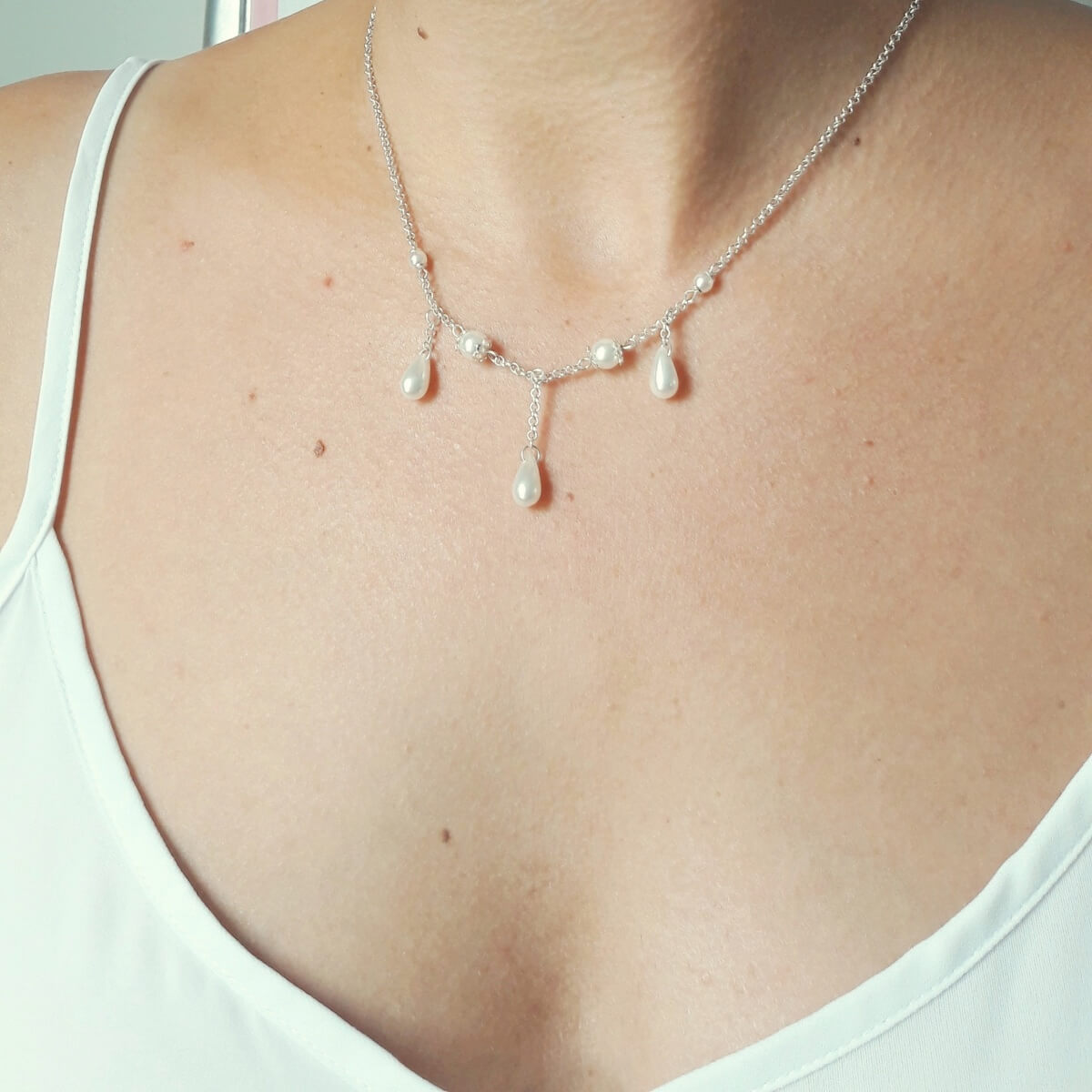 Ce collier mesure 47 cm avec deux anneaux de réglages. Le pendentif goutte du milieu mesure 2.5 cm.