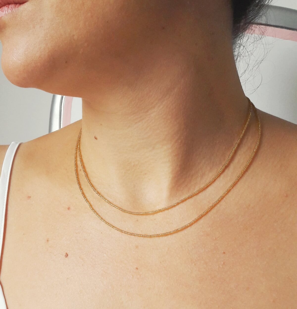 Les perles utilisées sont les plus petites perles de rocailles qui existent et la finesse de ces modèles donne l’impression de n’avoir qu’un fil doré, léger et scintillant autour du cou.