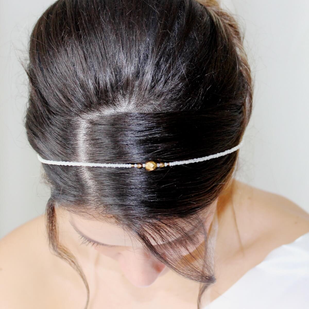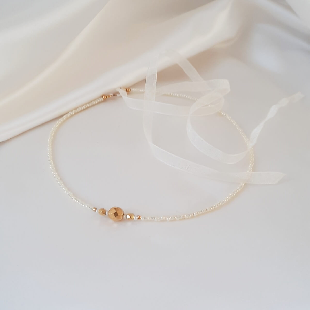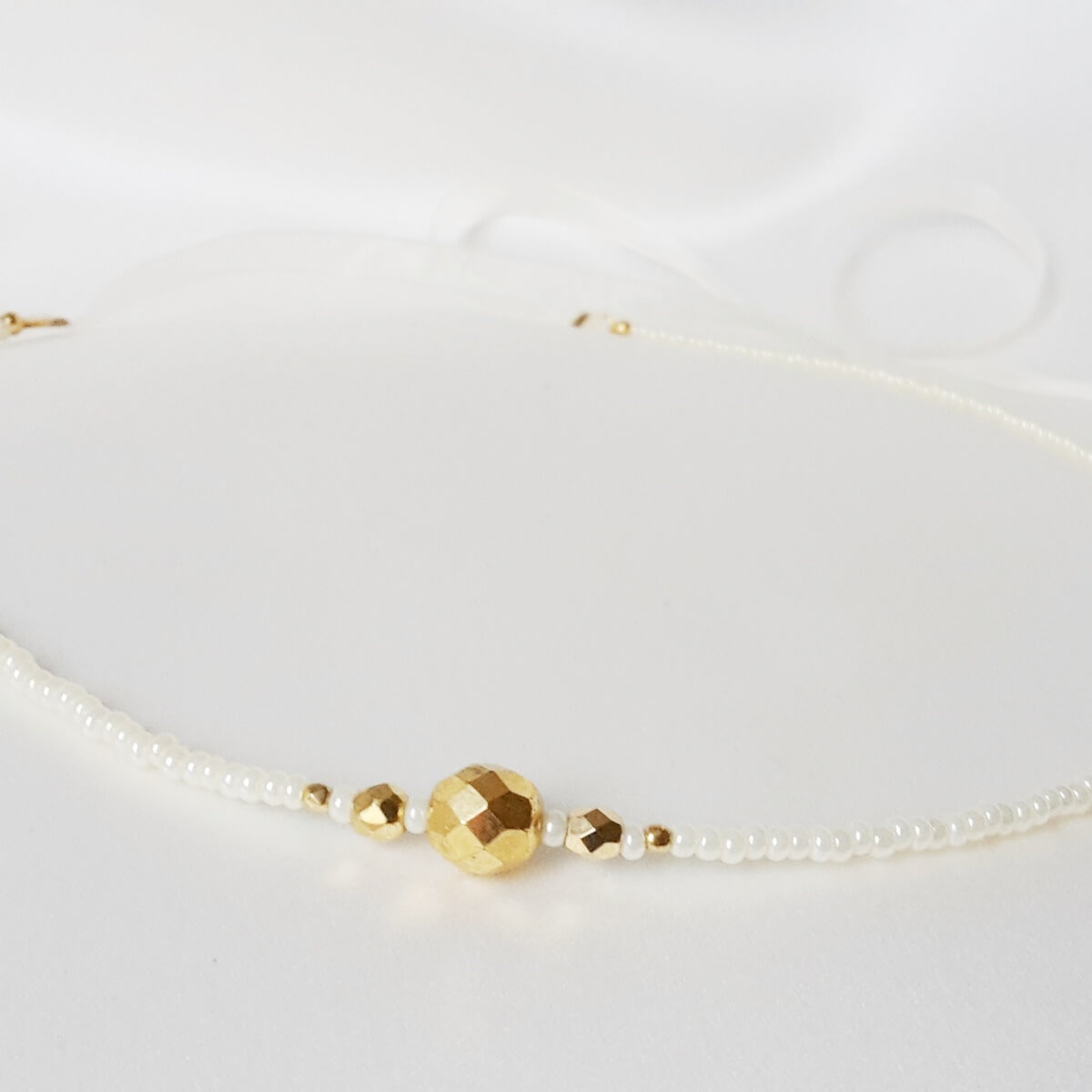 L’Ornement de Cheveux ÉLISE, très simple et élégant, est un headband de mariée composé d’un fil de perles de rocaille (2.5mm) « Preciosa Ornela », couleur crème nacré et de plusieurs perles à facettes en plaqué Or 24 k.