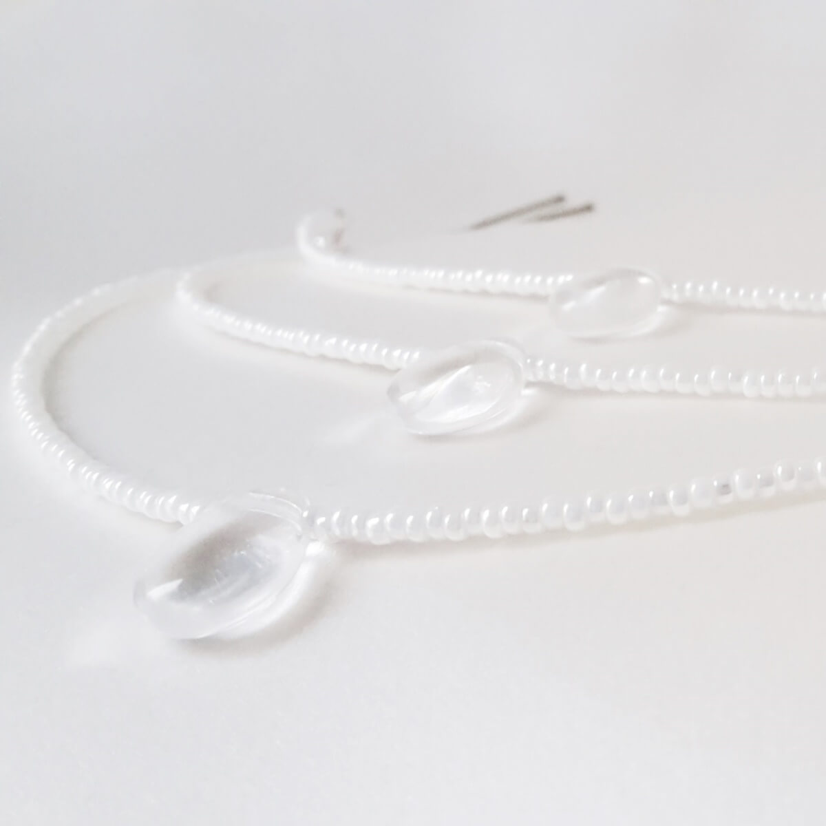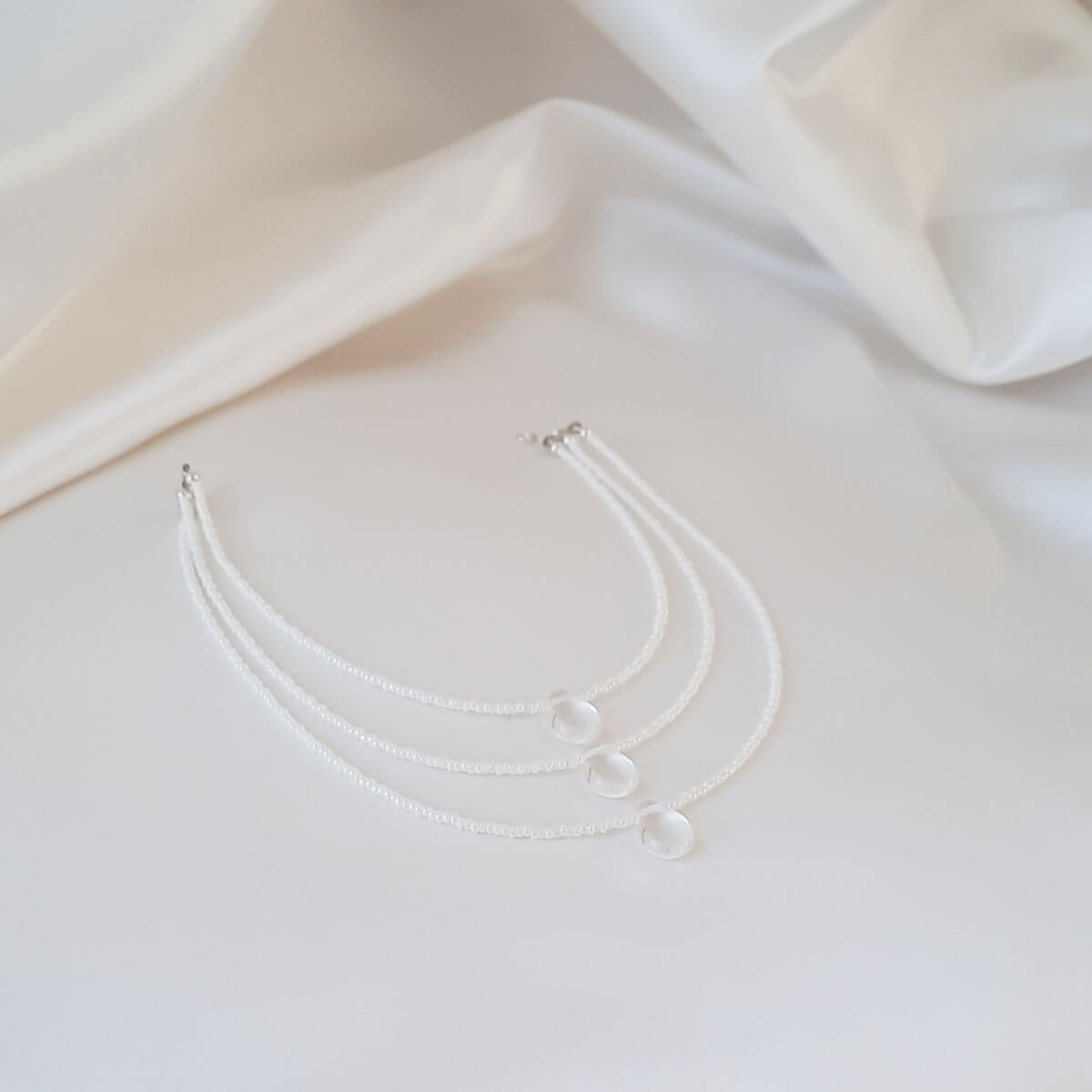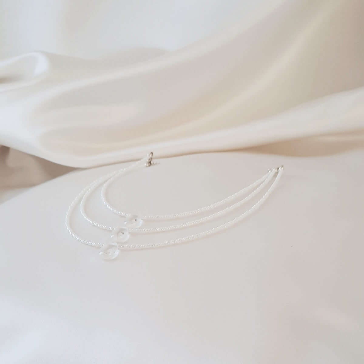 Ce bijou de cheveux est composé de trois rangs de petites perles de rocailles « Preciosa » blanche nacrées de trois tailles différentes.