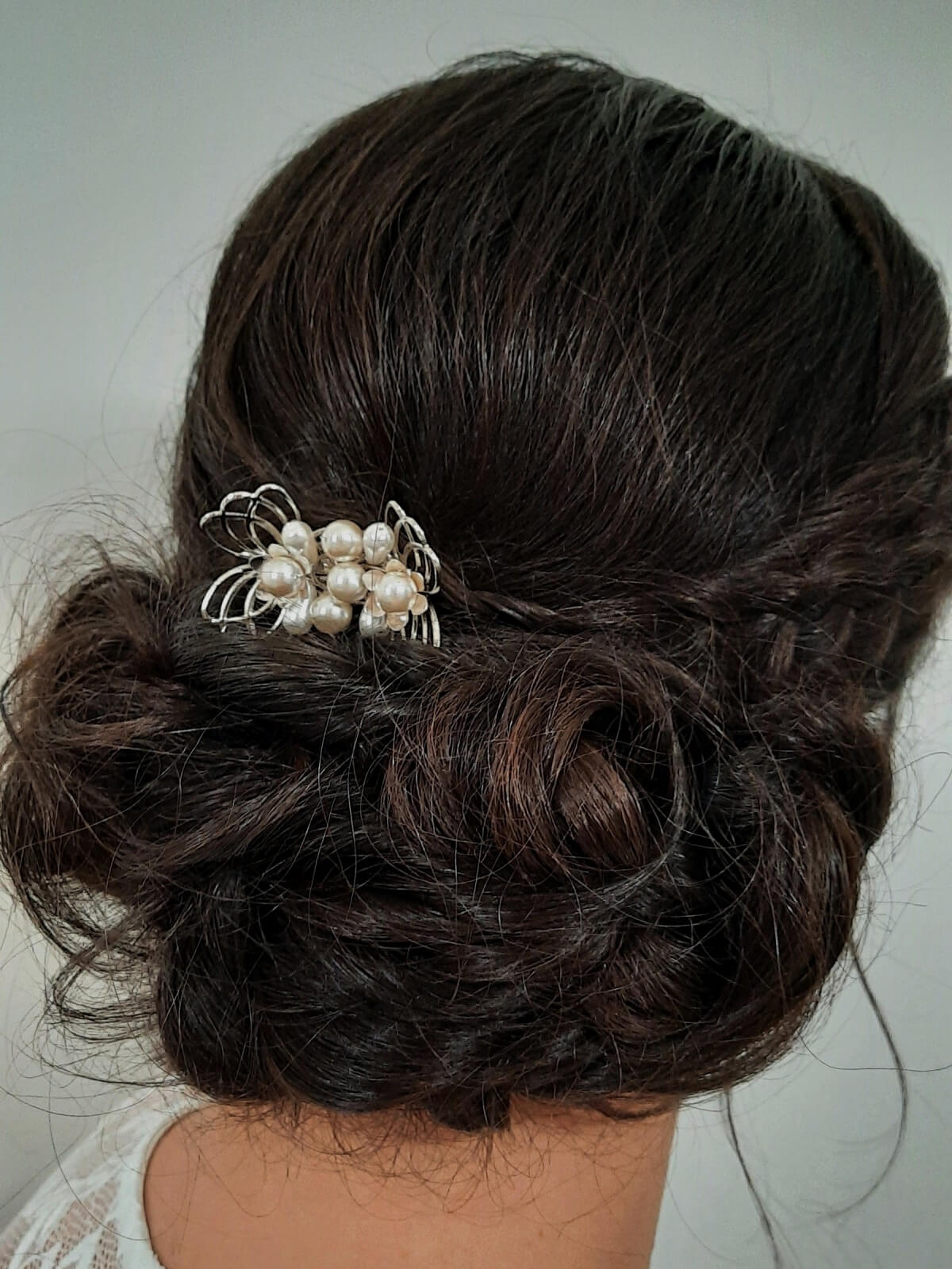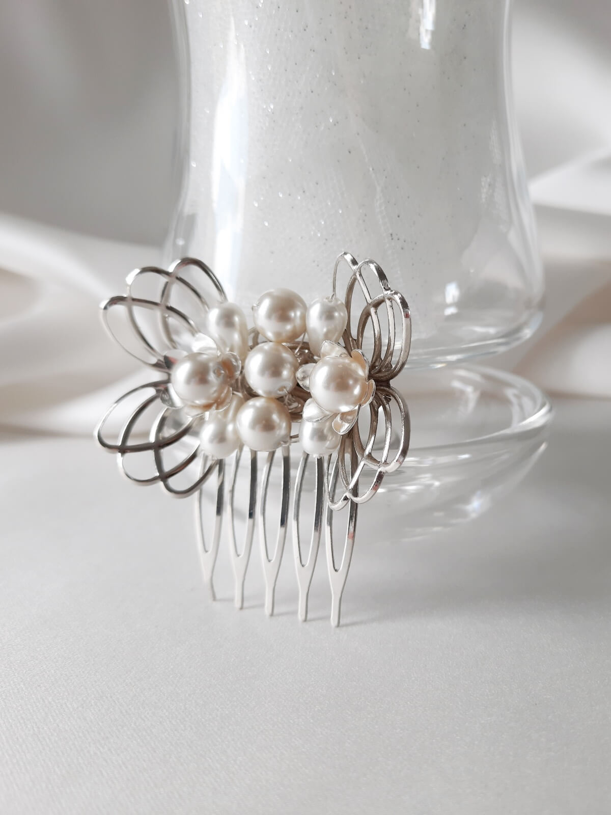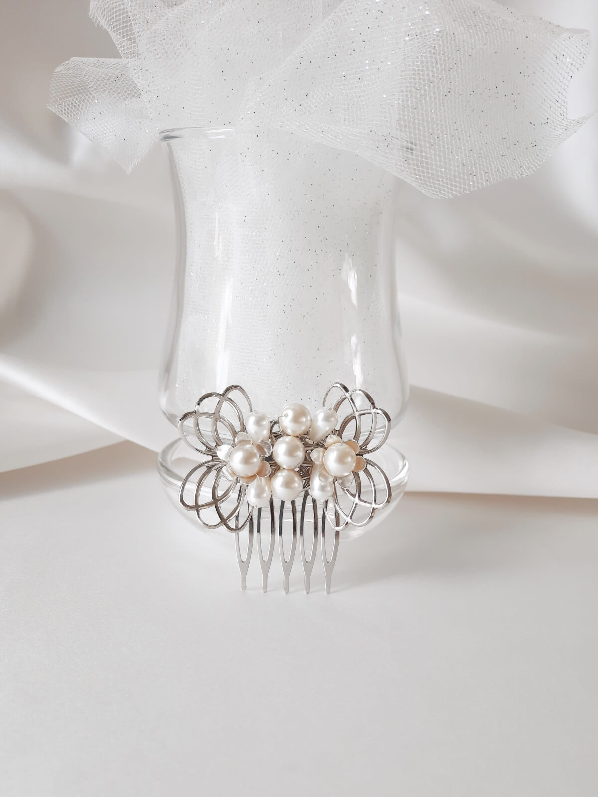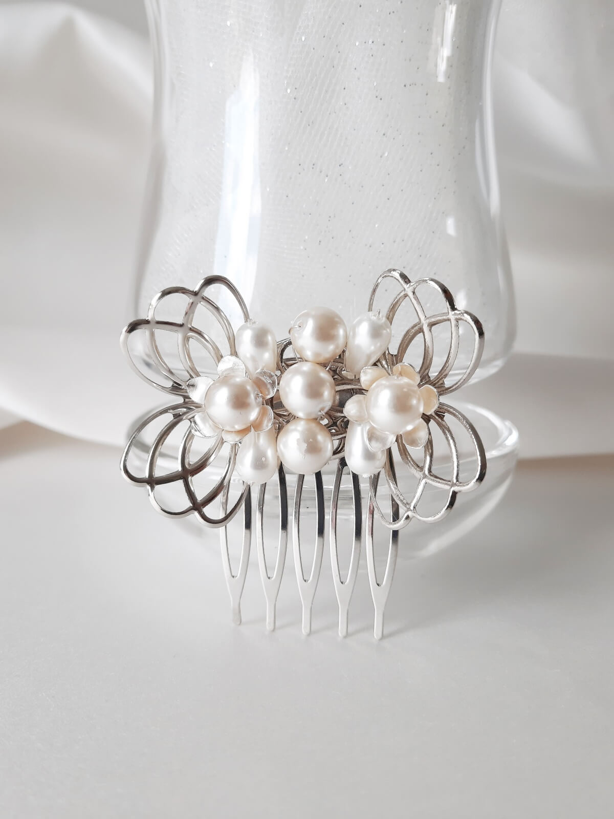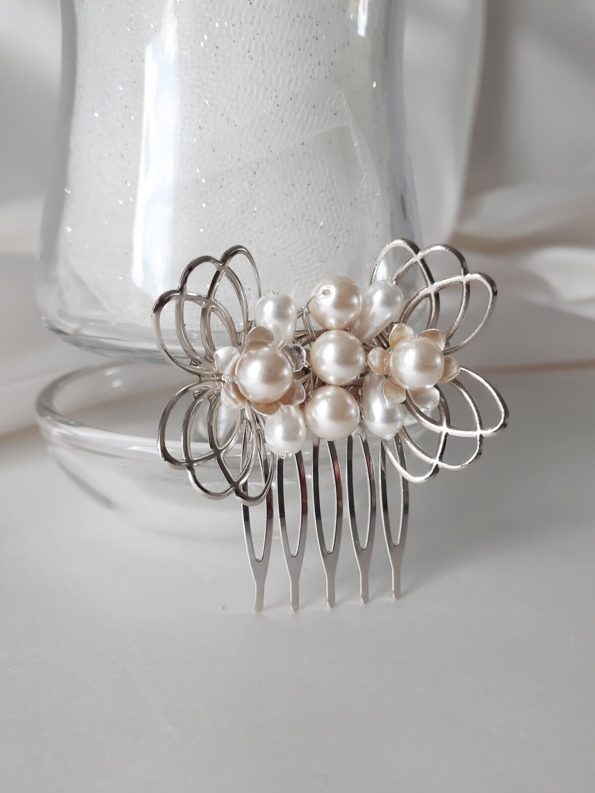 Cet accessoire de coiffure de mariée est composé de 2 rosaces argentées,  de perles de verre nacrées gris clair, de 2 gouttes nacrées blanches et de petites fleurs métalliques argentées.